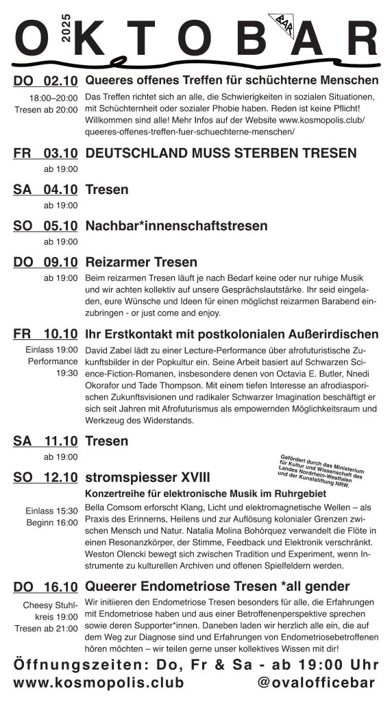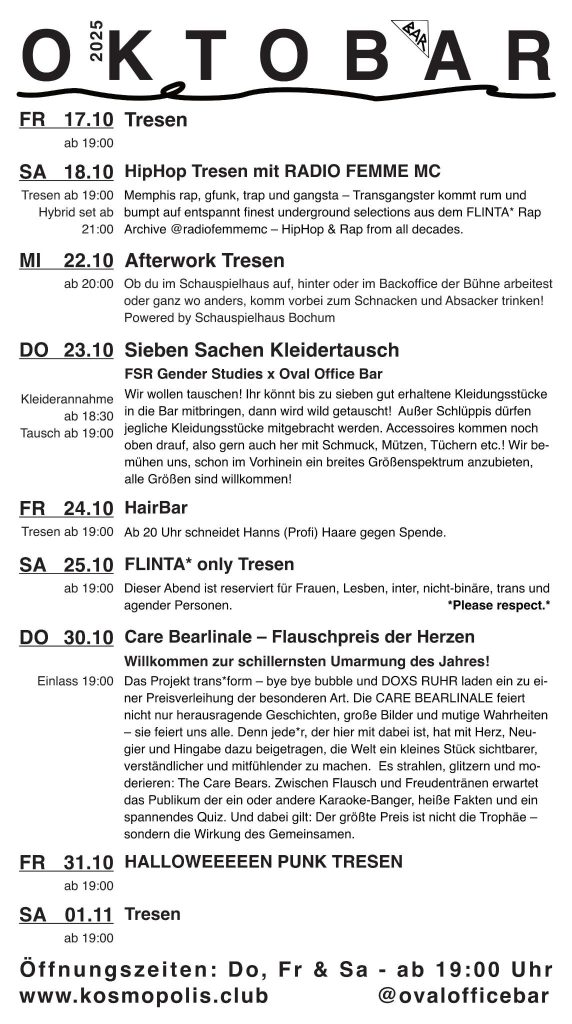 Hier bist du richtig für Informationen rund um die Oval Office Bar und ihren Trägerverein KosmoPolis – eingetragener Verein für queere Nachtkultur.