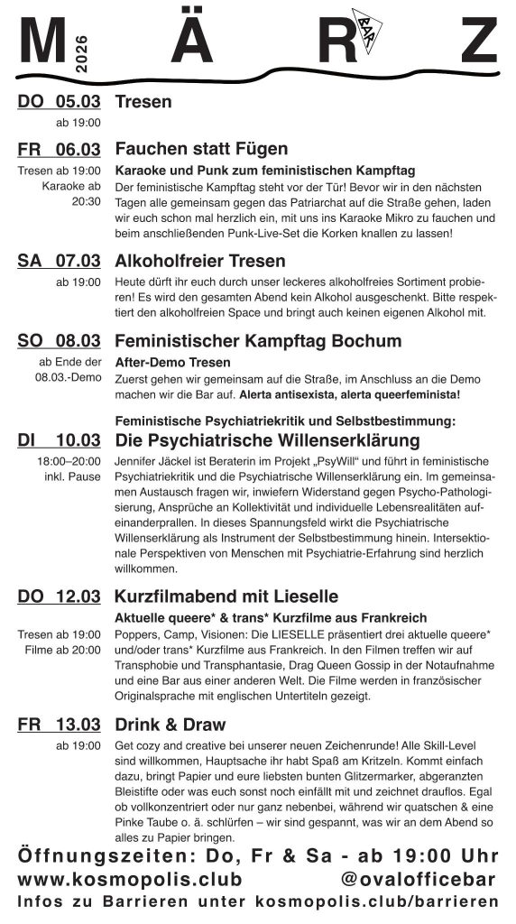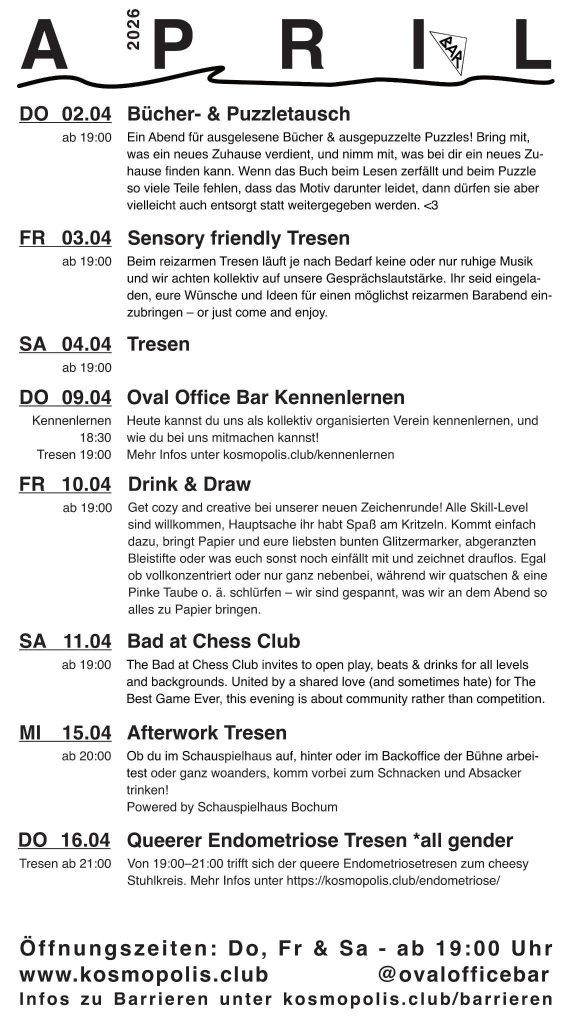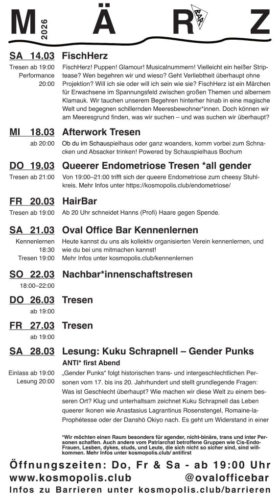 Hier bist du richtig für Informationen rund um die Oval Office Bar und ihren Trägerverein KosmoPolis – eingetragener Verein für queere Nachtkultur.