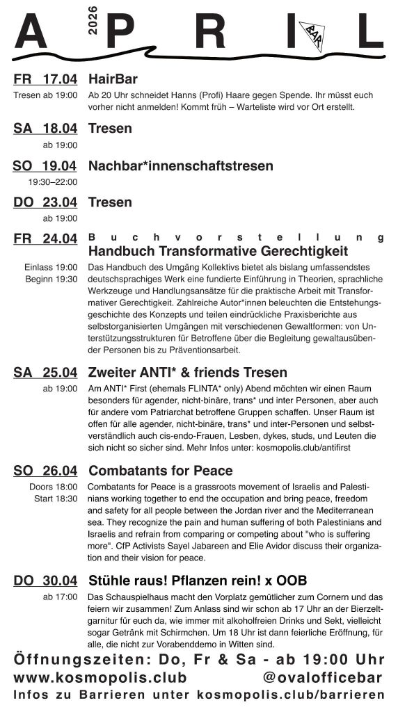 Außerdem treffen wir uns mindestens zweimal im Monat im Plenum (online und analog im monatlichen Wechsel). Da planen wir zusammen das Programm in der Oval Office Bar und was sonst noch so ansteht. Für mehr Infos schreib uns eine Mail oder komm am besten vorbei – zum Beispiel bei unserem regelmäßigen Kennenlerntreffen.